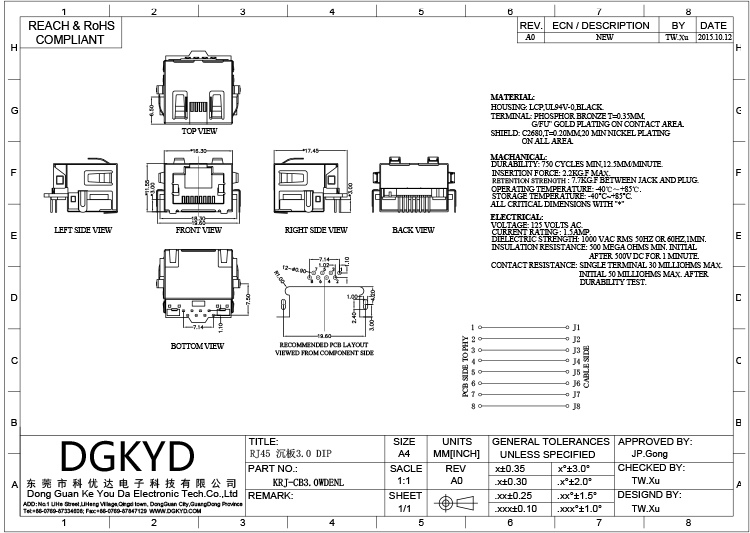 SMT Sinking Board Shielded RJ45 Jack Single Port With EMI Fingers , Low Profile KRJ-CB3.0WDENL Images |